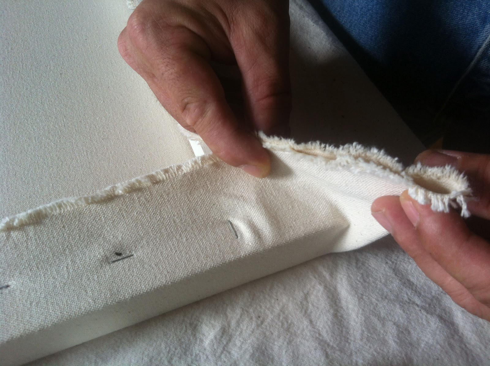 Lean your finished canvas upright against a wall for a day or more to allow the weave to settle into its new position. After a few days, use a small amount of water on the back of the canvas to tighten it further if needed. Be careful not to use too much water or the stretchers will warp, and the canvas will be virtually useless, having an uneven surface to paint on. The finished canvas should be taunt like a drum, making a deep reverberating sound when lightly tapped.