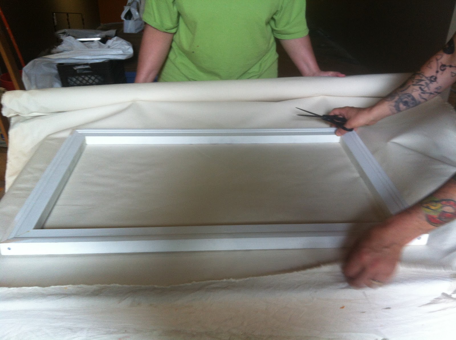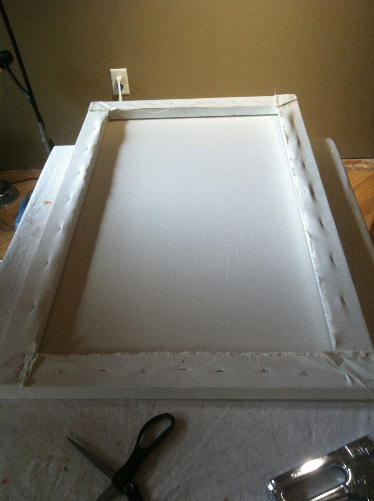 At this point you should have 20 staples into the mix. Again divide the distance between each staple in half, stapling each half mark between all the staples around the entire frame. We now have 36 staples in the mix. Repeating this process again and again until the staples are between two and four inches apart.