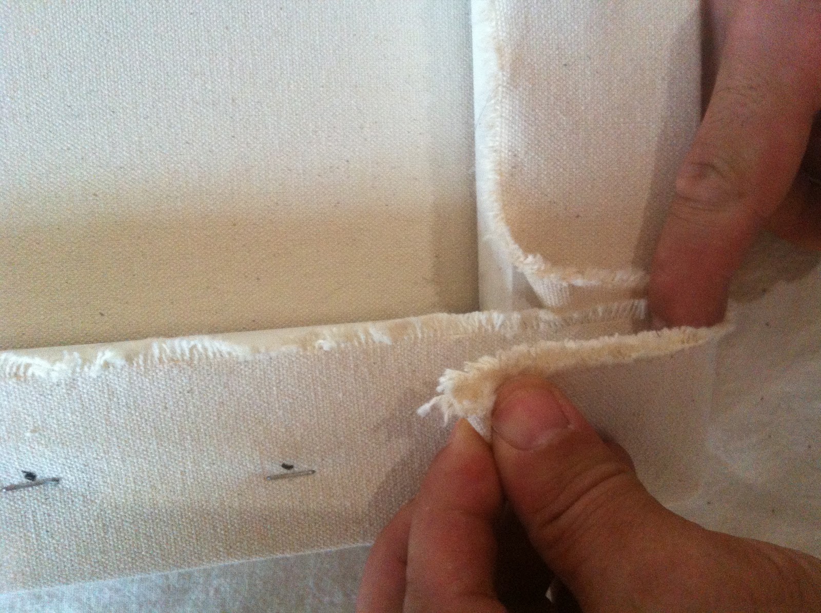 With the canvas set in place, now start the stretching process with the corners. You want to start your staples at the bottom line of the adjoining stretcher. So if your stretchers are two inches thick, you want to start your corner two inches from the actual corner. Chose one of the longest sides and first staple its left corner, pulling the canvas tight again, but not taunt. The placement of the corner staples should be in the center mass of the stretcher, lined directly with the adjoining stretcher’s inside edge. Working in a counter-clockwise direction, do the same to the remaining three left sided corners being sure at this point to pull the fabric taunt with each staple. Repeat the process on the right sided corners of each, again moving counter-clockwise around the canvas and pulling the fabric taunt.