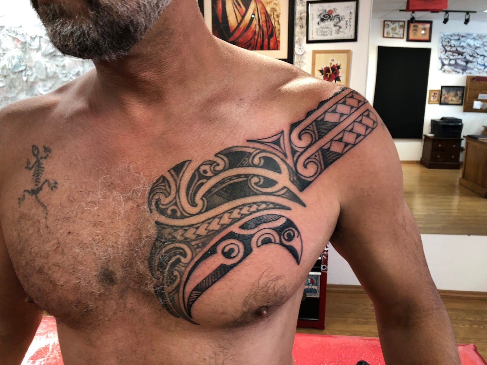 I added some Polynesian tribal to the work I did last year. The client wanted to continue the work into next year. It will be nice to complete this when he comes back. I can see us adding on to this tattoo for a long time.