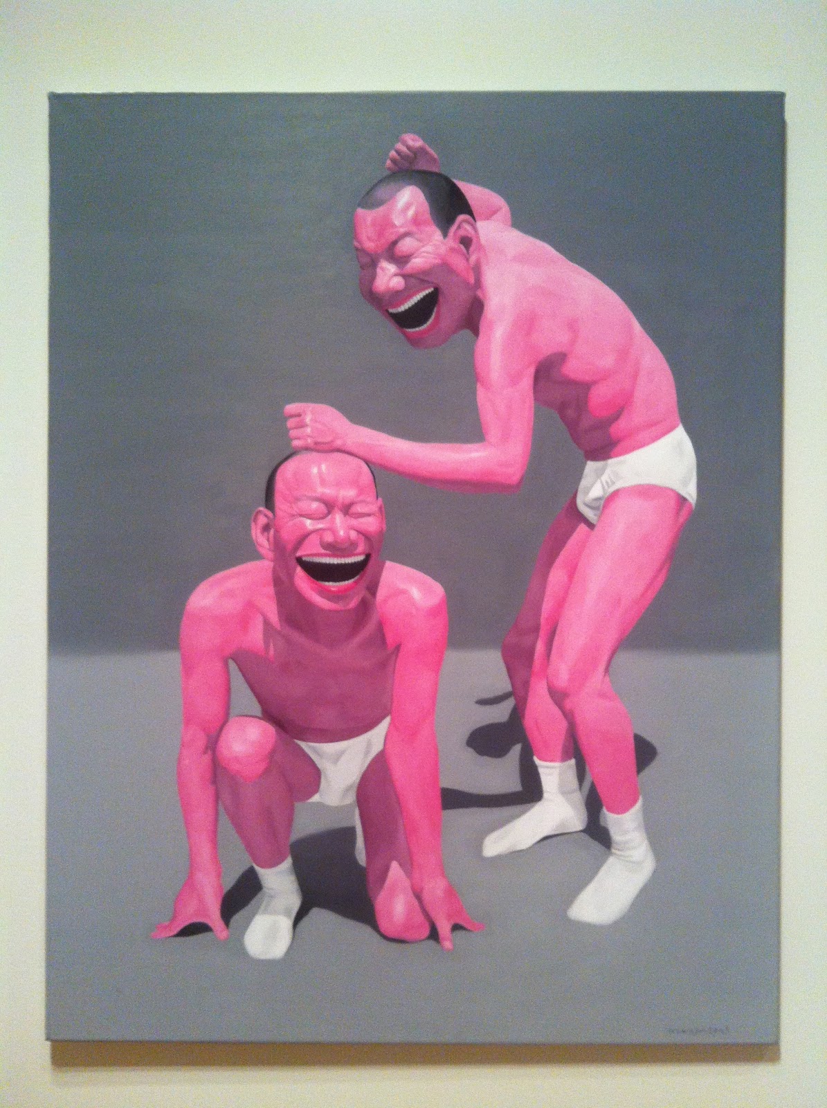 Yue Minjun is a contemporary Chinese artist living in Beijing. His work is obvious in telling us the mental state of his world. He is a cynical realist. Are these men frozen in states of laughter, or simply holding that happy smile for presentation? They are anything but laughing.