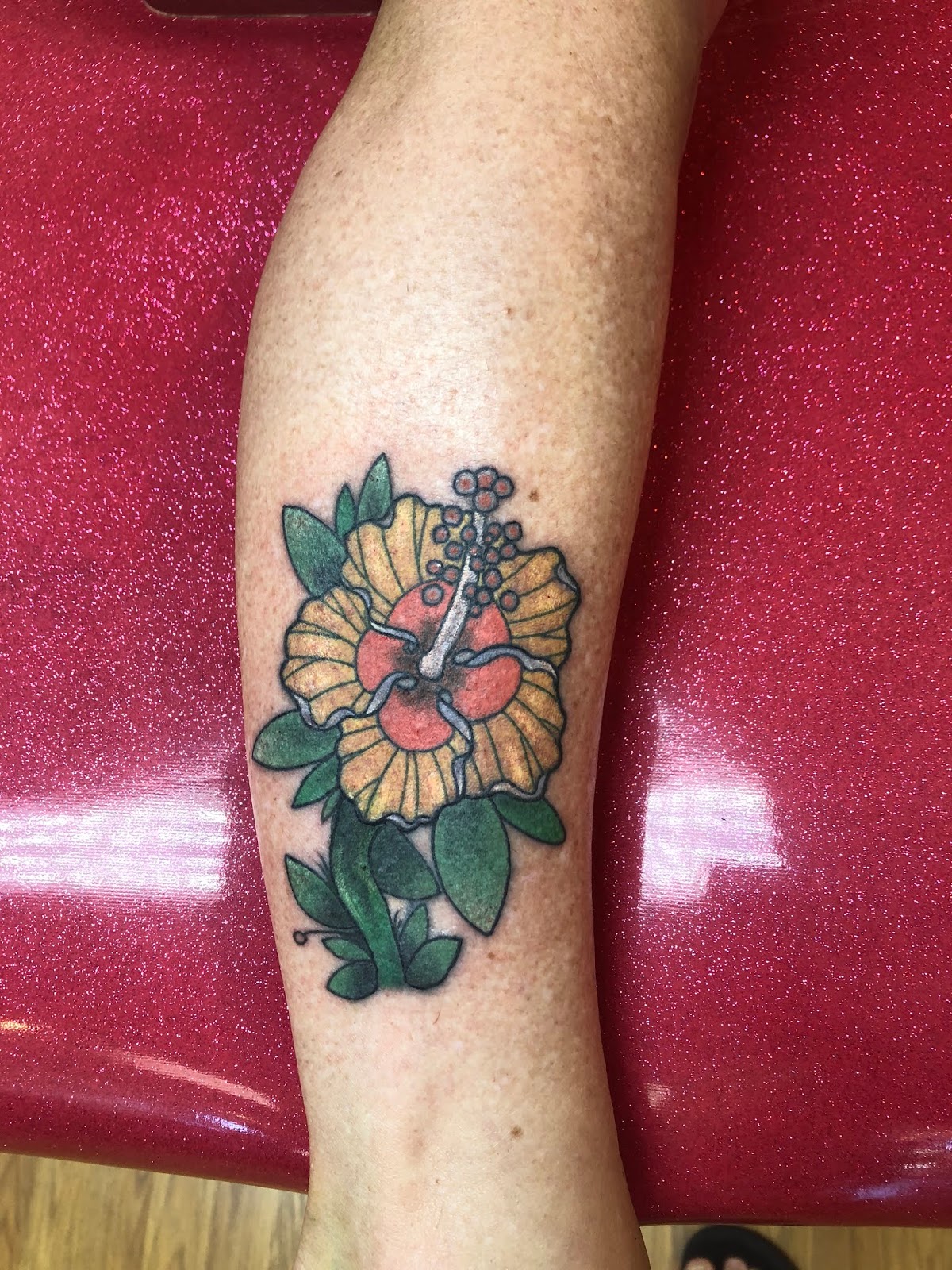 The client wanted me to make a “Nintendo” like hibiscus flower to cover up an older tattoo. I was asked to not show the original tattoo out of embarrassment for what it was.