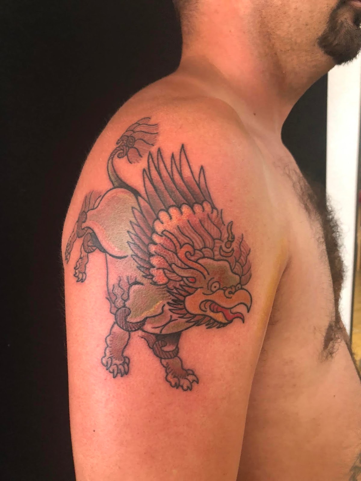 Garuda the Devourer. He is the lord of birds, and after 500 years of incubation he hatched. As a Buddhist and Hindu god, Garuda is here to terrify mankind with his hurricanes created by the power of his beating wings. This was a really fun tattoo.