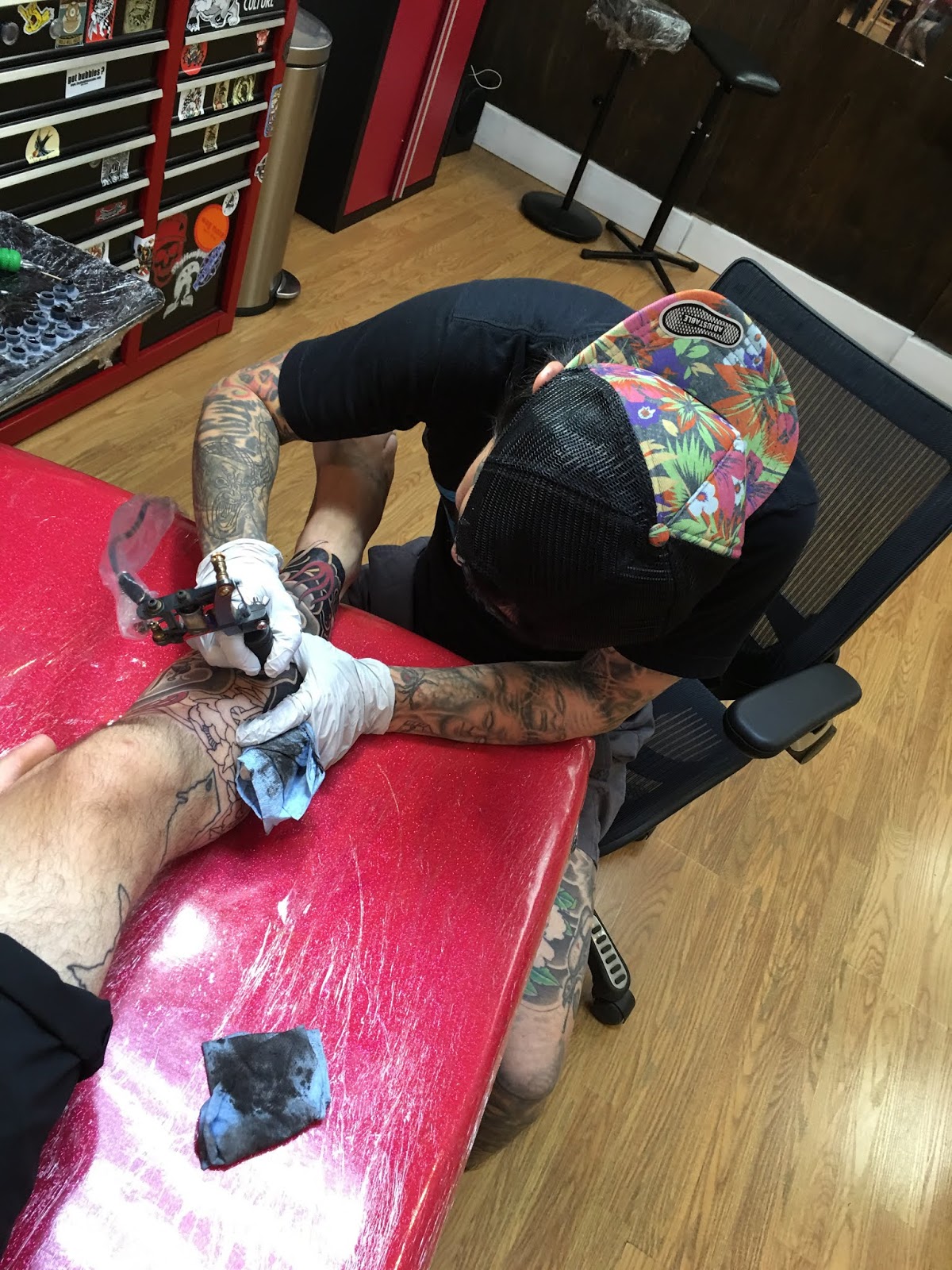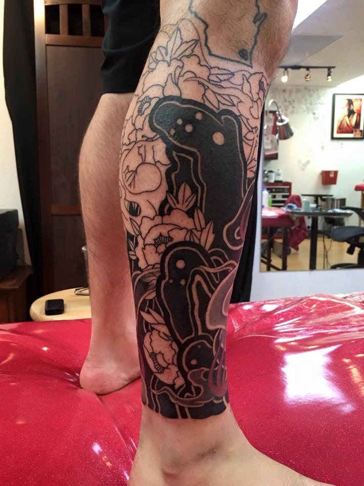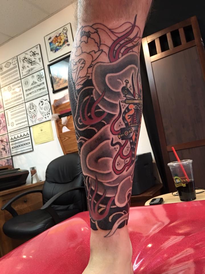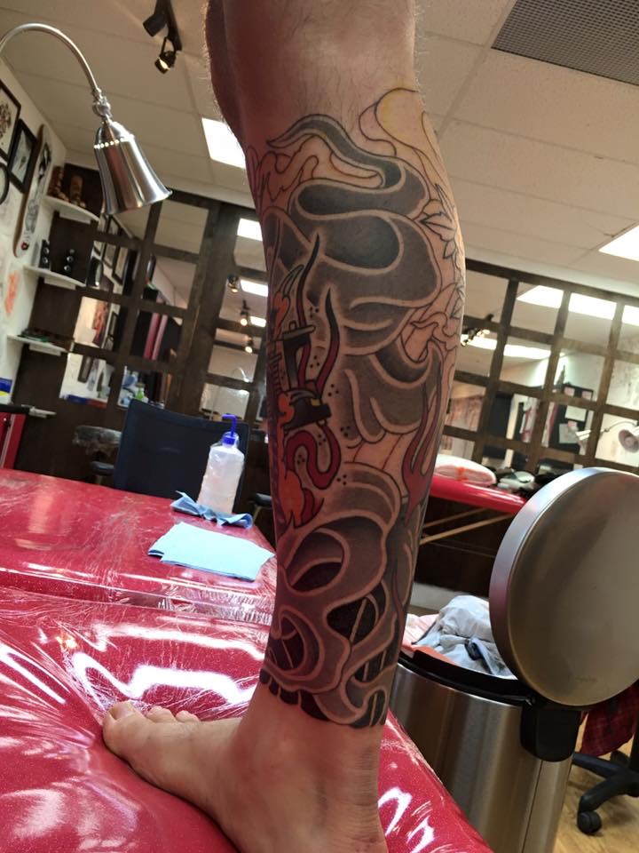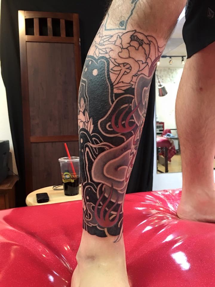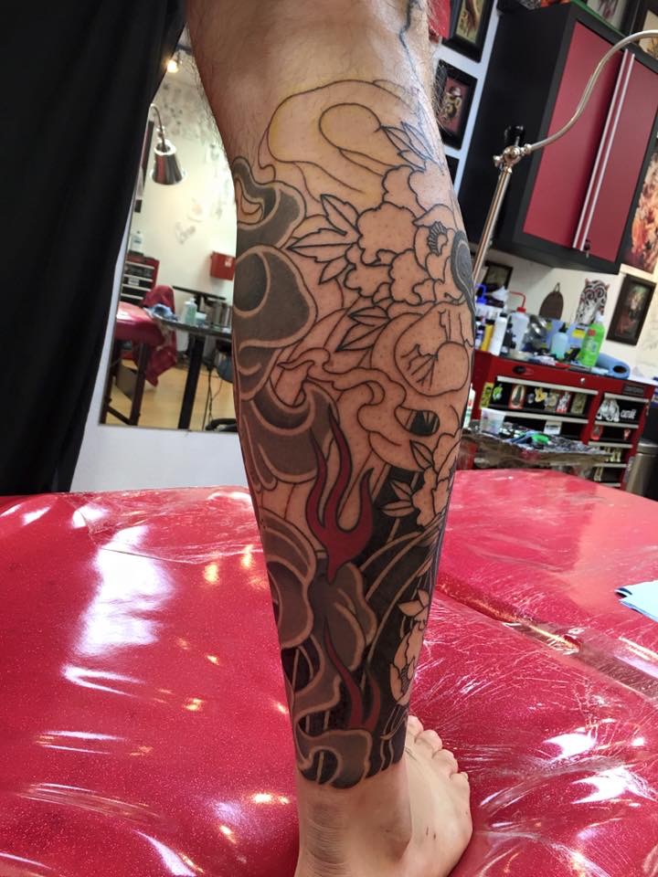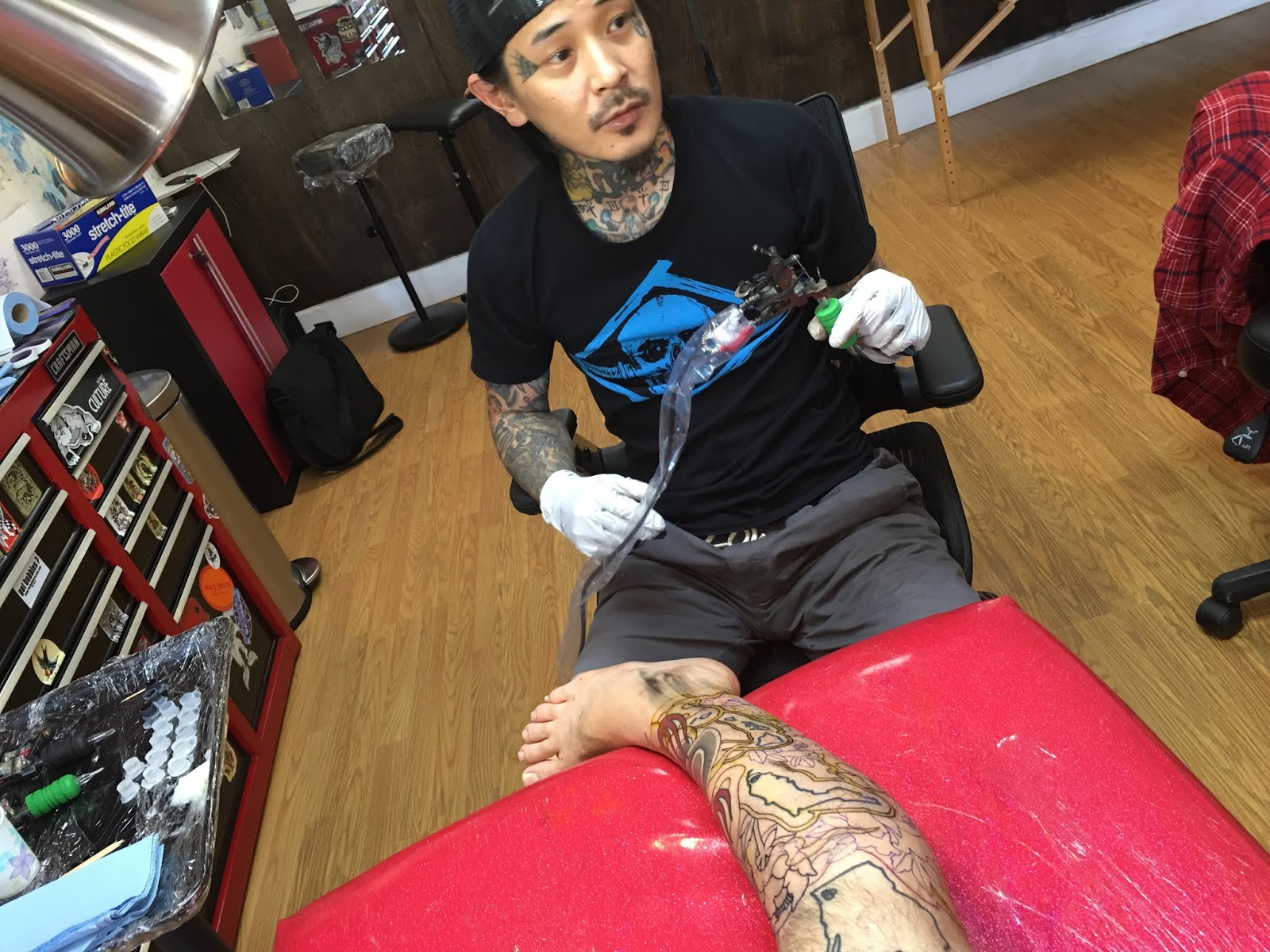 My friend Gak from Japan is going to start the line work for my leg today. We did a portion of the tattoo last year, and we are going to add on today. We plan to tattoo my entire leg from ankle to hip. I am pretty excited for this.