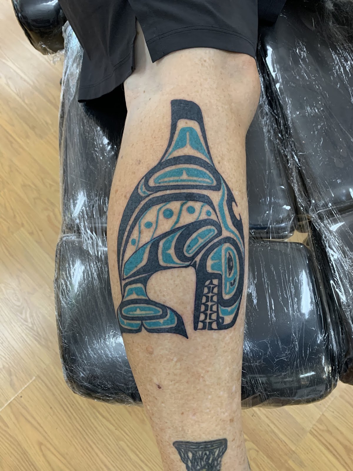 This client has been back to the shop year after year. He is in his 70’s and has truly dedicated his current life towards rescuing animals in need. He works with an organization called ifaw back home helping rescue sea life. He has been tattooed here by Trevor and myself a few times. His knowledge and research on Haida artwork is amazing. It was truly a pleasure to work with him.