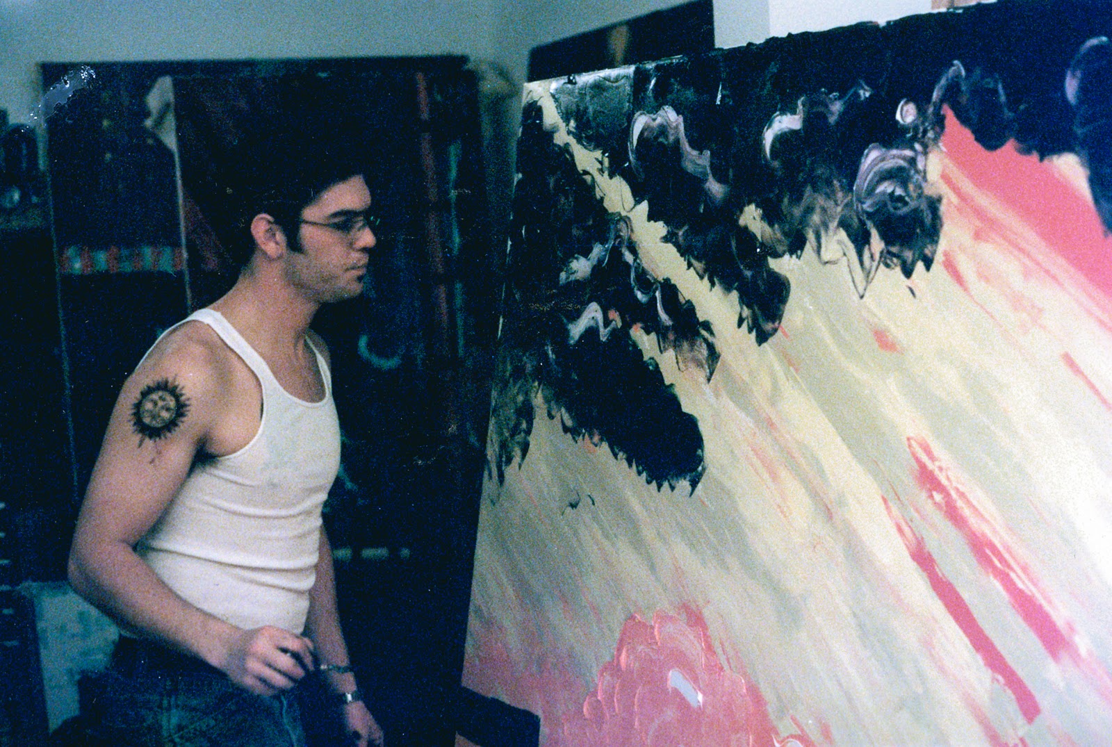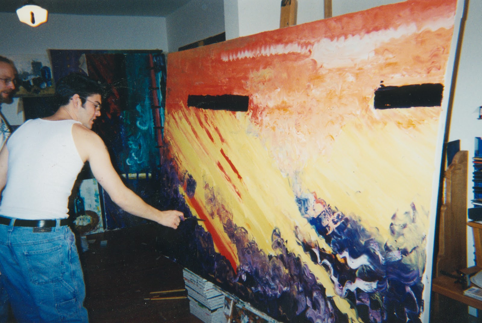 This painting, Improvisation 33: “Loring Park Sky” (80×60), was one of my major works during my Improvisation series. It took me several days of constant work to complete this painting. I barely slept or ate. Being too into the moment of this work (and not wanting any of the paint to start to dry so I could continuously change it as needed), I just drank coffee and smoked cigarettes for four or five days until I completed the painting.