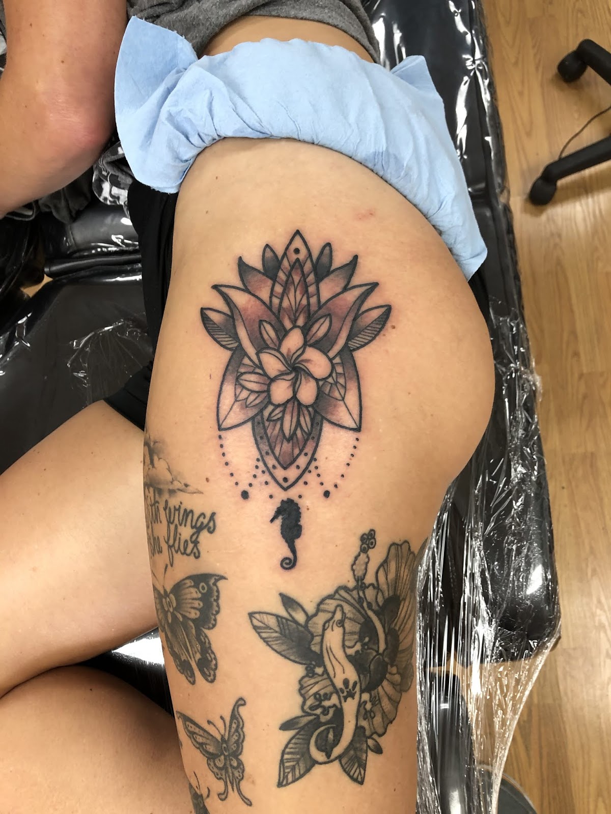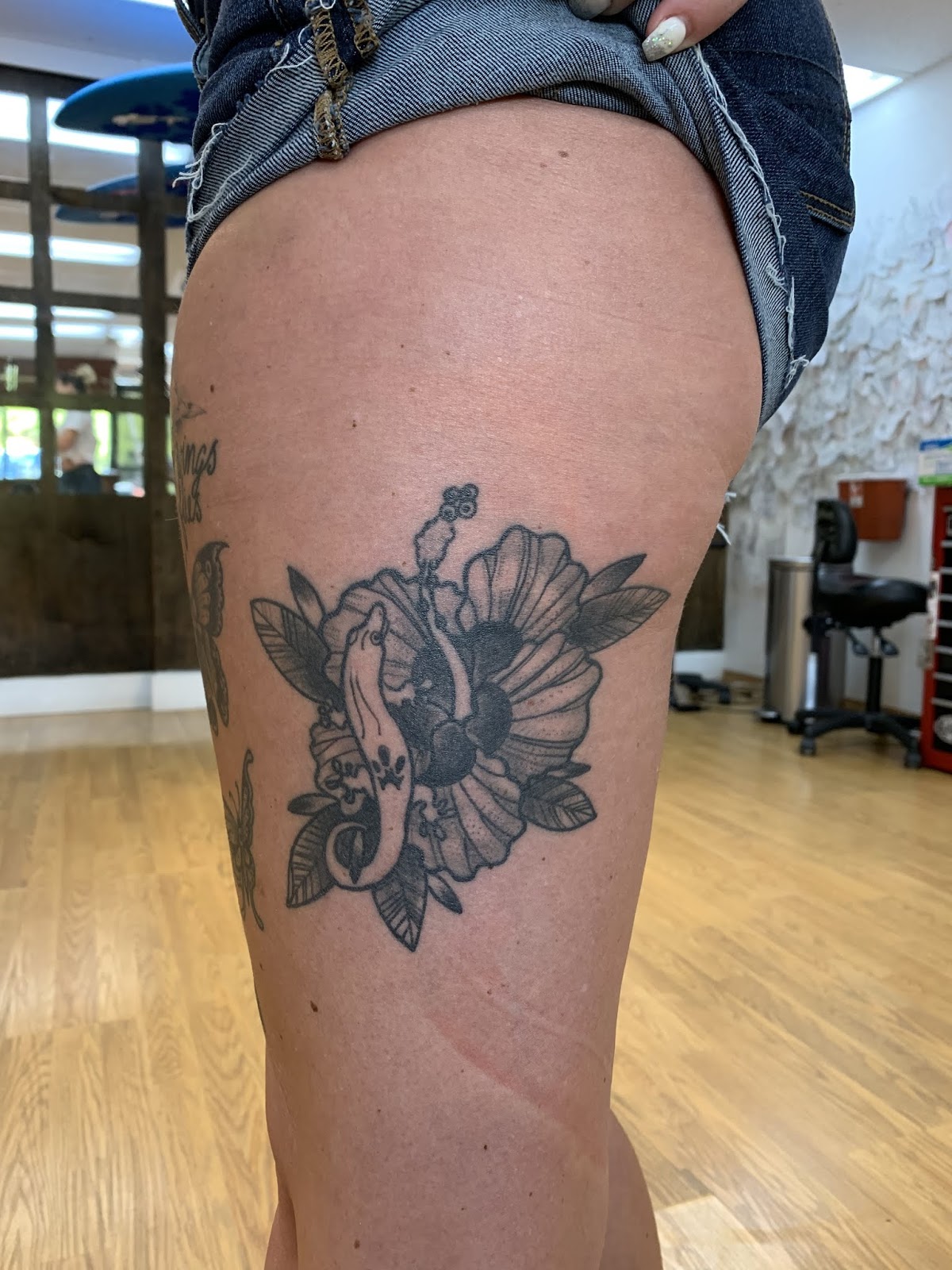 My client from last year came back and wanted to add more work to her hip. Her tattoo from last year healed pretty nice. This was really fun as it is always good to see old clients return.