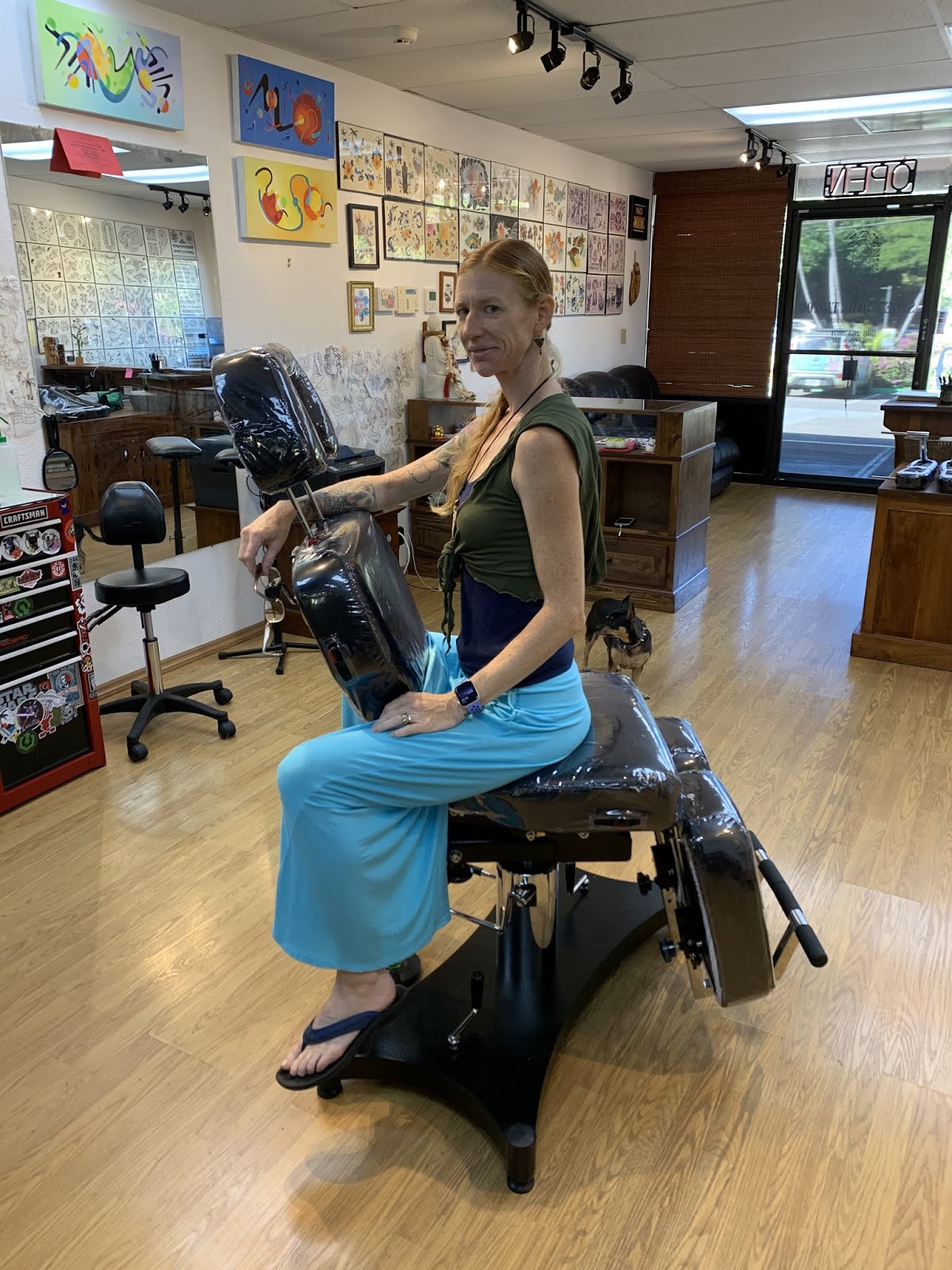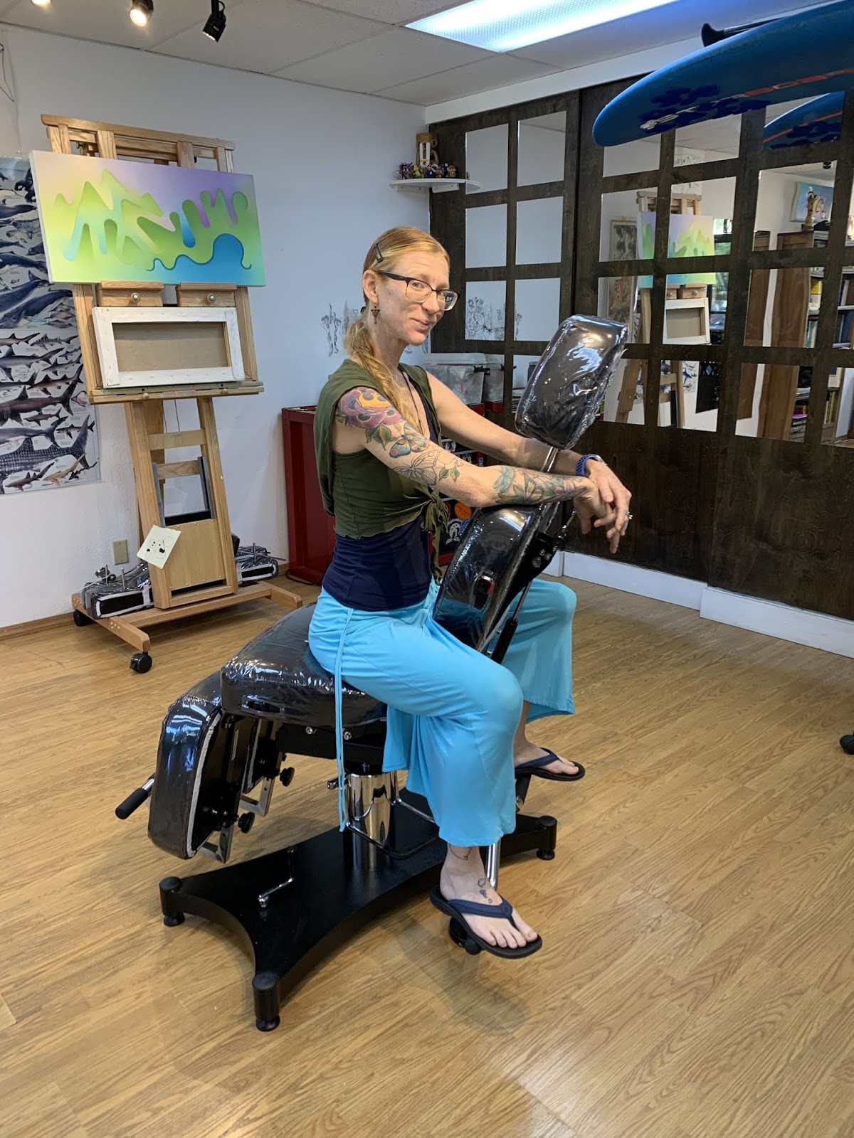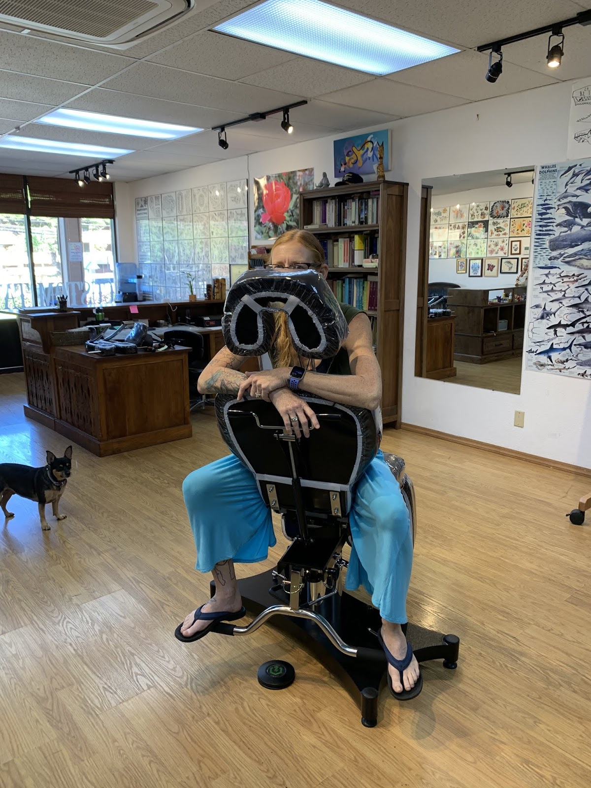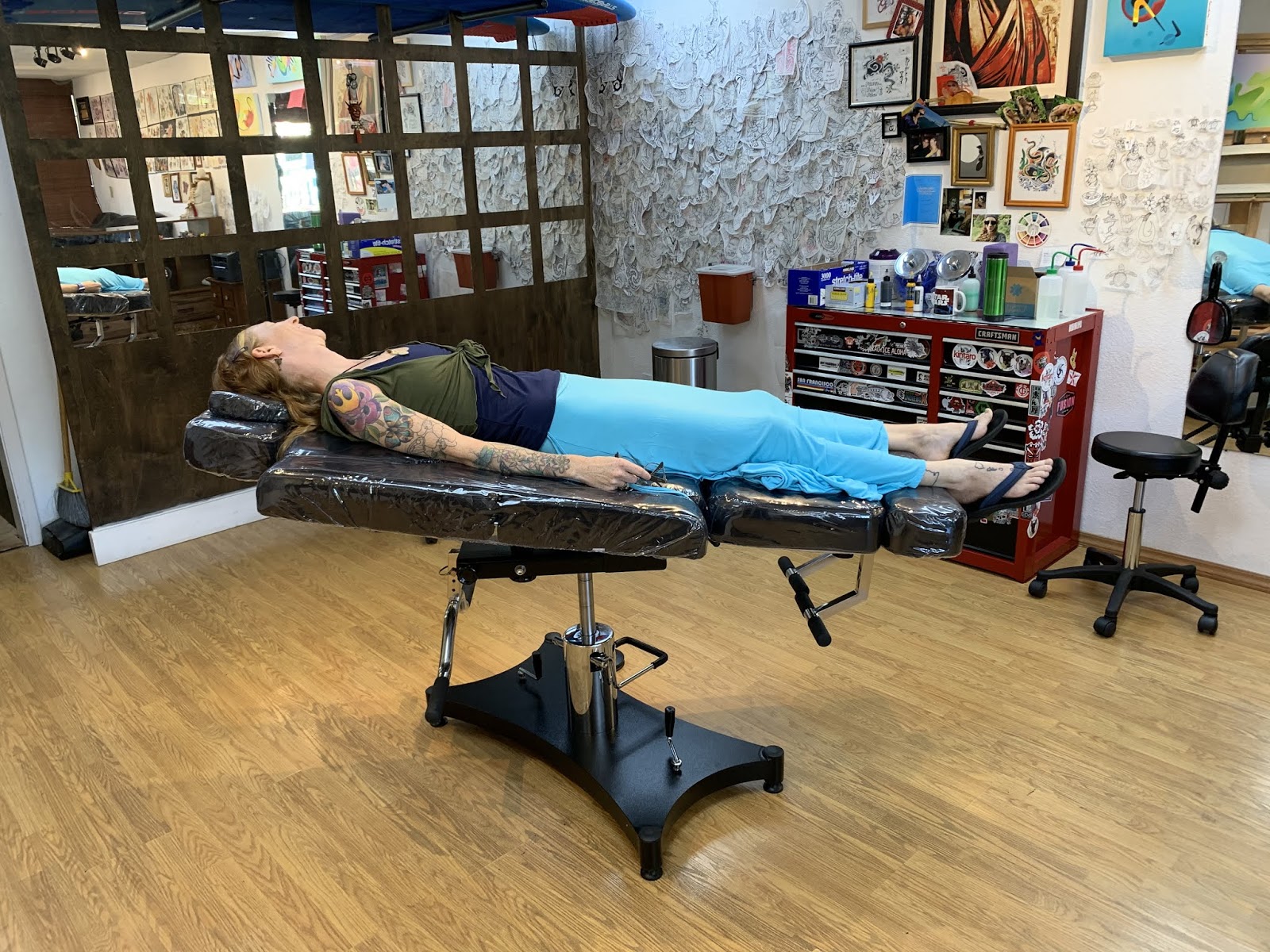 The reverse sitting is fantastic so I can tattoo the back easily. I have always struggled with tattooing one-off tattoos on the back because of the clients position. Having them sit like this makes it easy for me to stretch the skin, more comfortable for the client to sit for a couple of hours, and I can stand while I tattoo them, which helps my back.