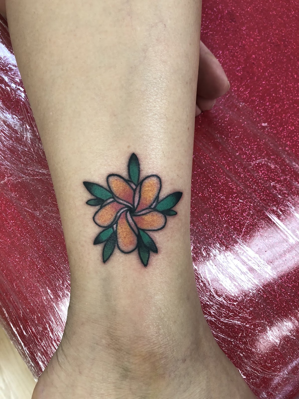 I love tattooing the plumeria. I gave this one an American Traditional twist.