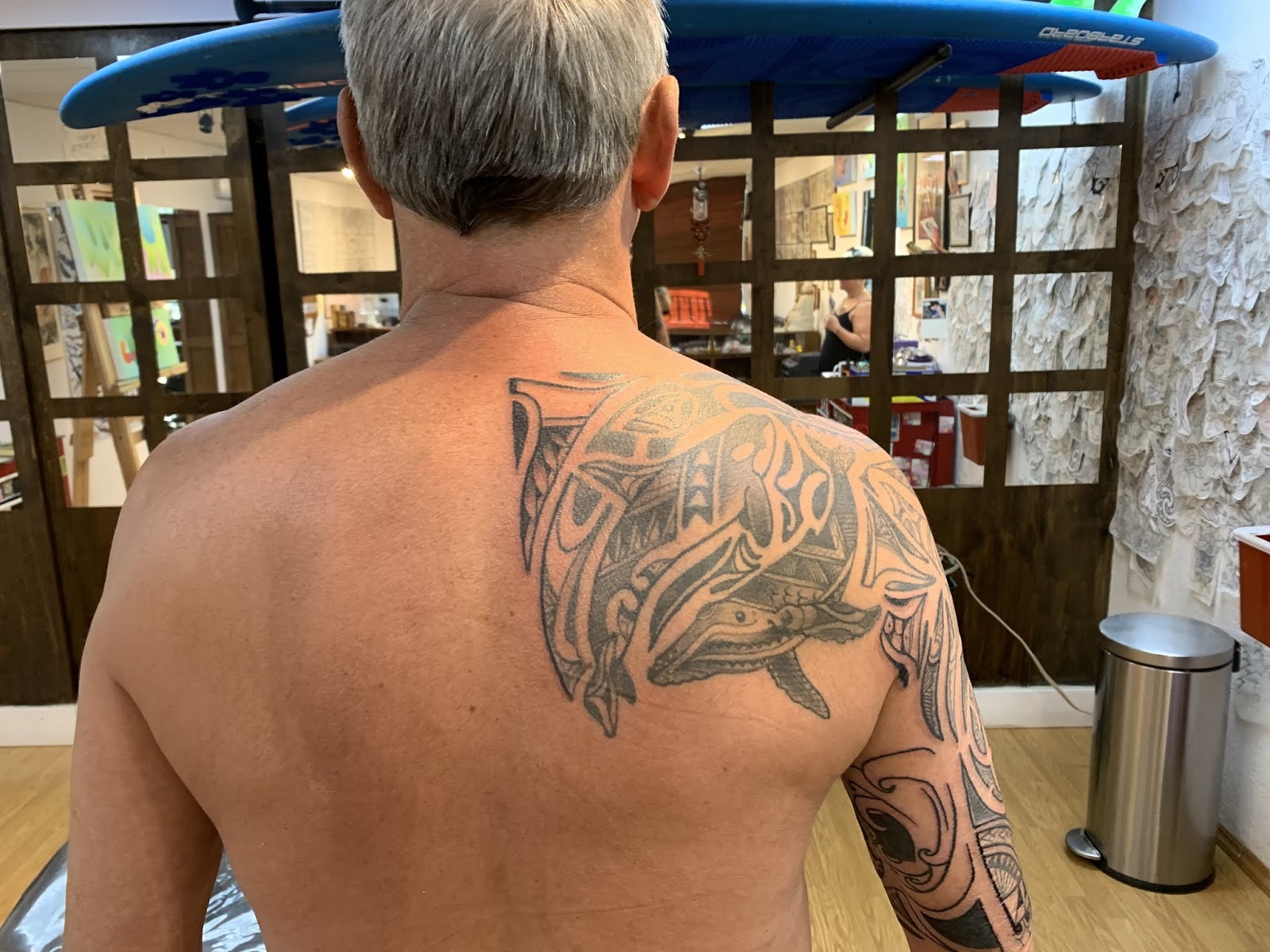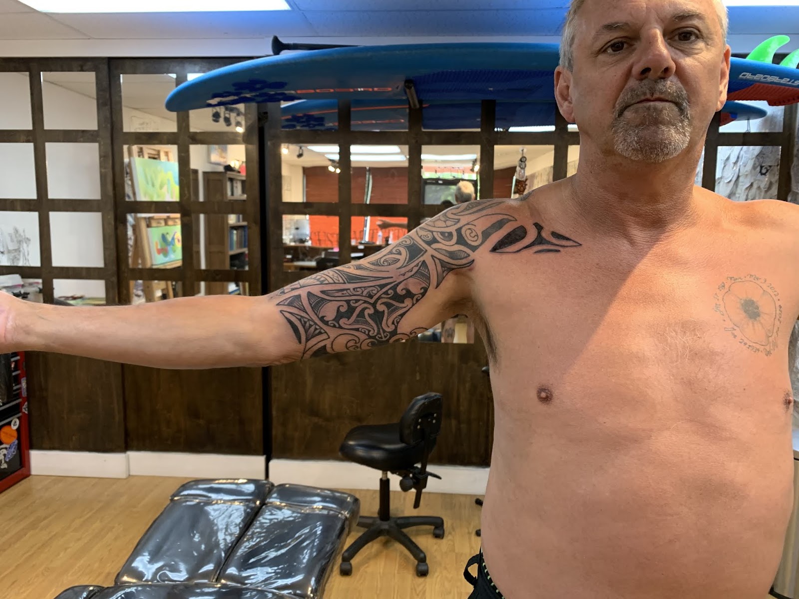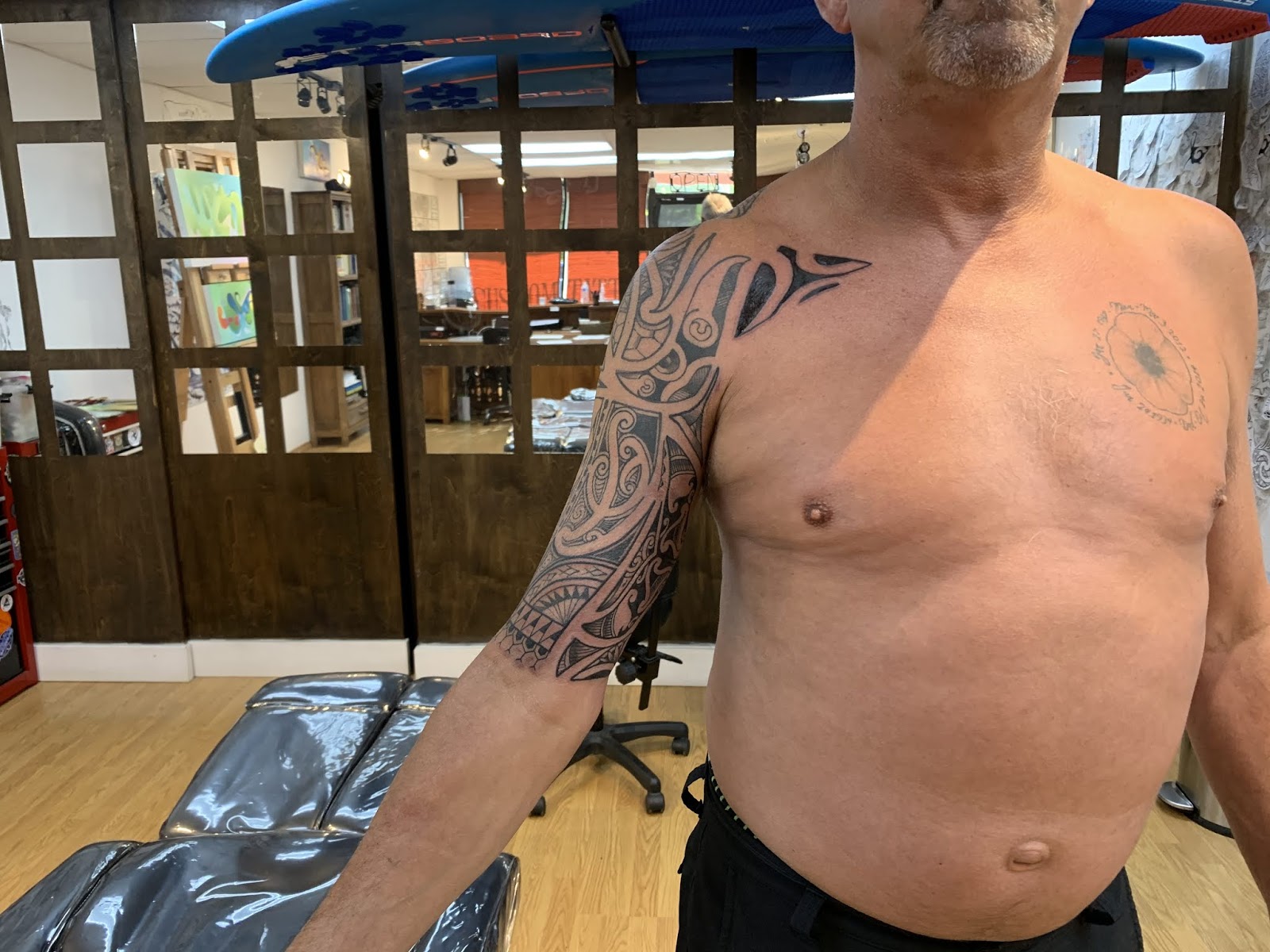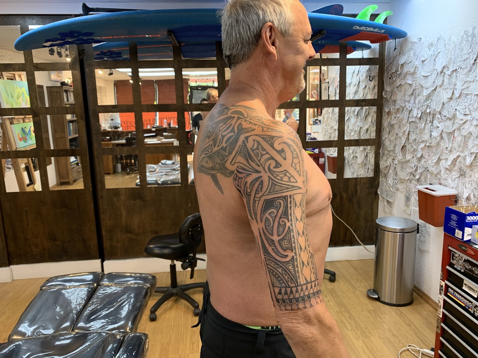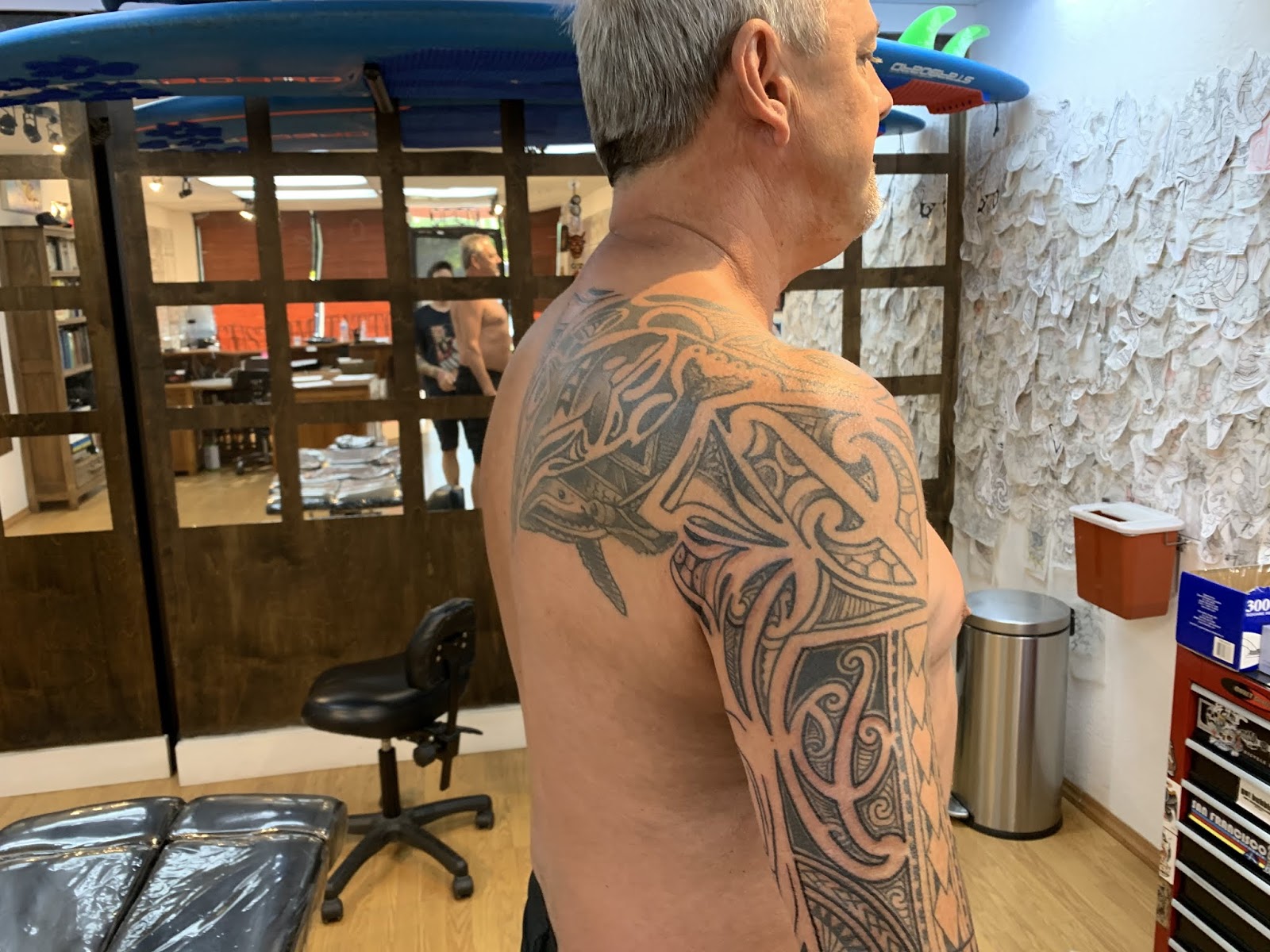 One of my regular clients is back, he comes back to the shop every year. We added some, and refined some of the existing work. This was really fun, and I am really looking forward to our next session where we will complete this entire piece.