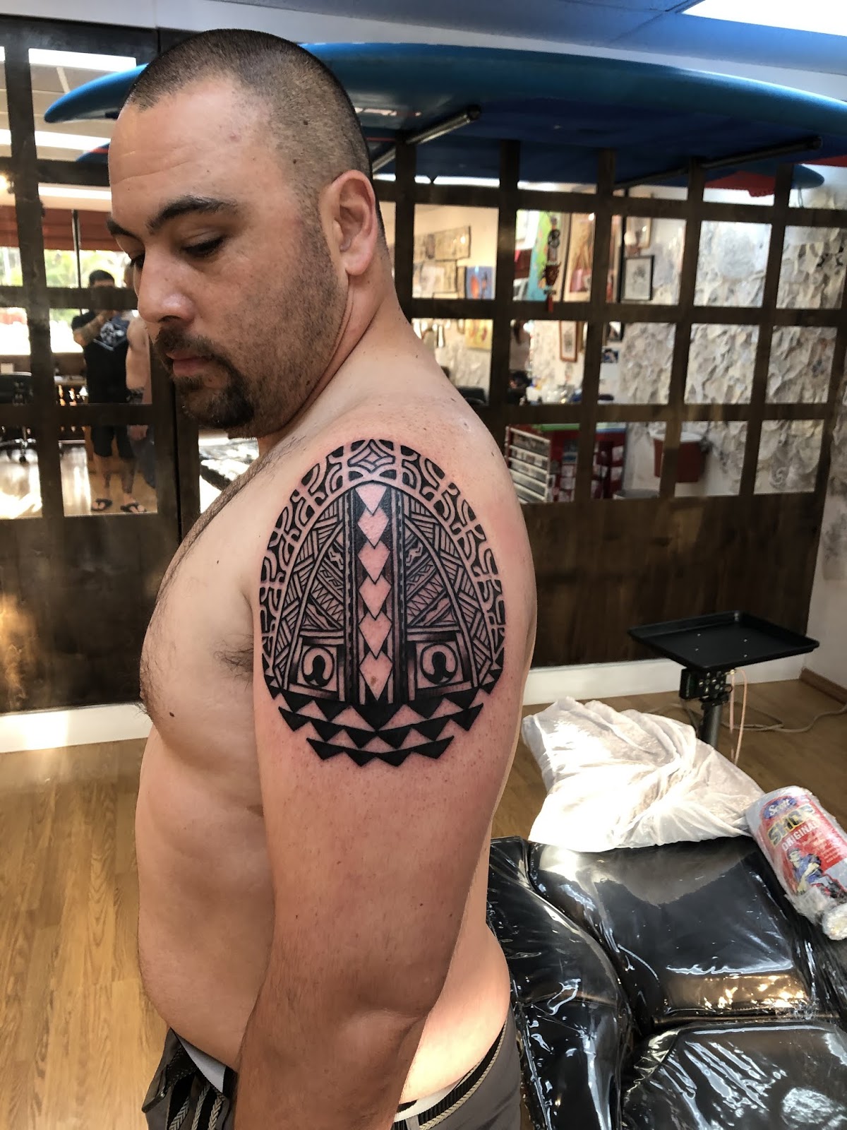 My client comes to the island often, and I will see him again soon for a second session on his arm. This was a fun tattoo. The tiki is abstracted like a mask.