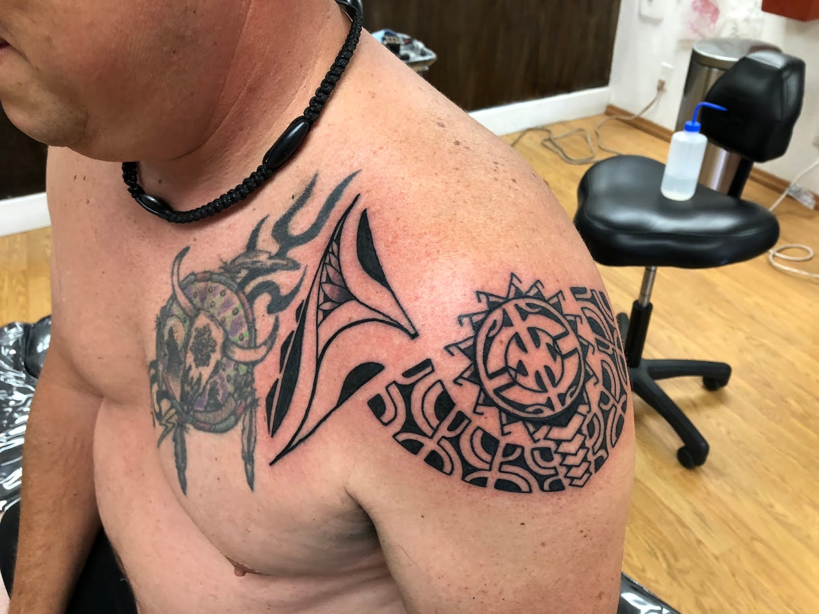 The client has a very large project in mind. Today we got started with the bolder portion of his work, and on his next session we will fill in the entire deltoid to his chest tattoo. He eventually wants to go all the way down the arm.