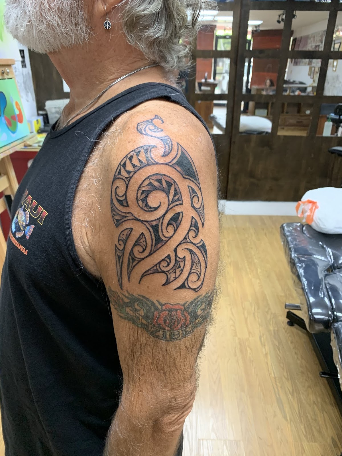 This was really fun. The client was here for a Polynesian turtle last year and has returned for some more tribal work. He brought me an image that inspired him.