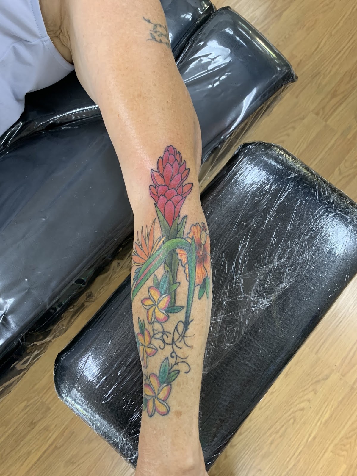My regular client is back for another session of Maui flowers on her arm. Today we added a red ginger flower. This is a long project, she only comes in for one flower at a time, and she picks the flower as we go, so it is going to take us a while until we are done.