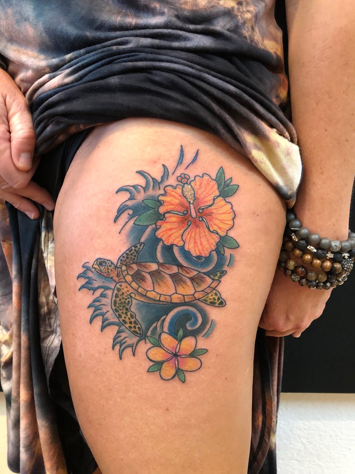 The client wanted a green sea turtle with a hibiscus and a plumeria inside water and waves with the style of a thinner American traditional tattoo. This was pretty fun.