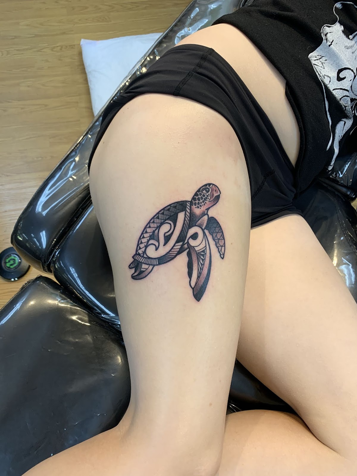 I got the opportunity to tattoo an American Traditional green sea turtle combined with Polynesian tribal inside it. I love tattooing this stuff because it is simply fun to draw and fun to tattoo.