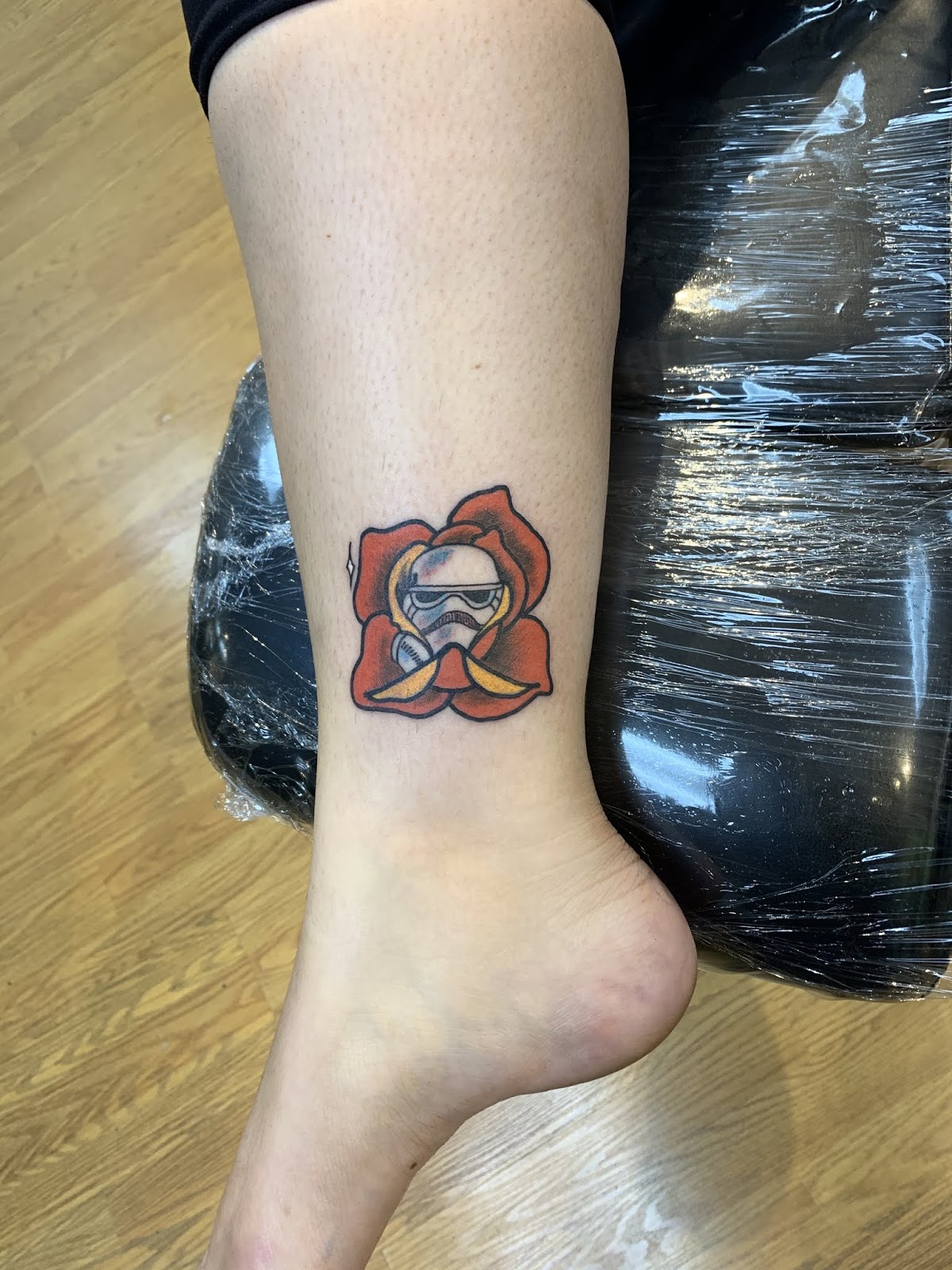 Star Wars is truly my absolute favorite escapism in the entire galaxy. I draw a lot of Star Wars stuff just for fun. To combine two things I love, American Traditional tattoo and Star Wars, well it is a pleasure. This was really fun to tattoo.