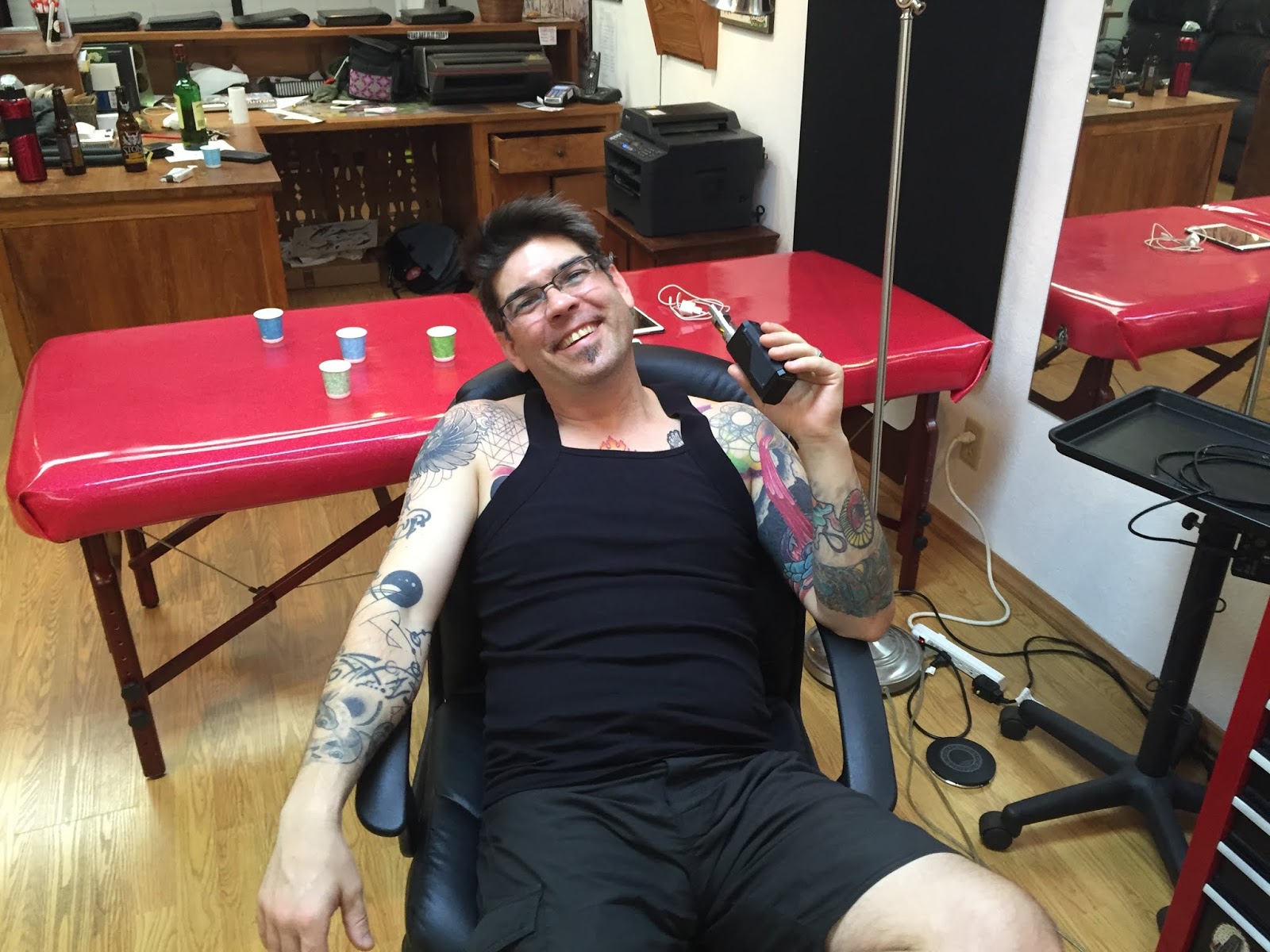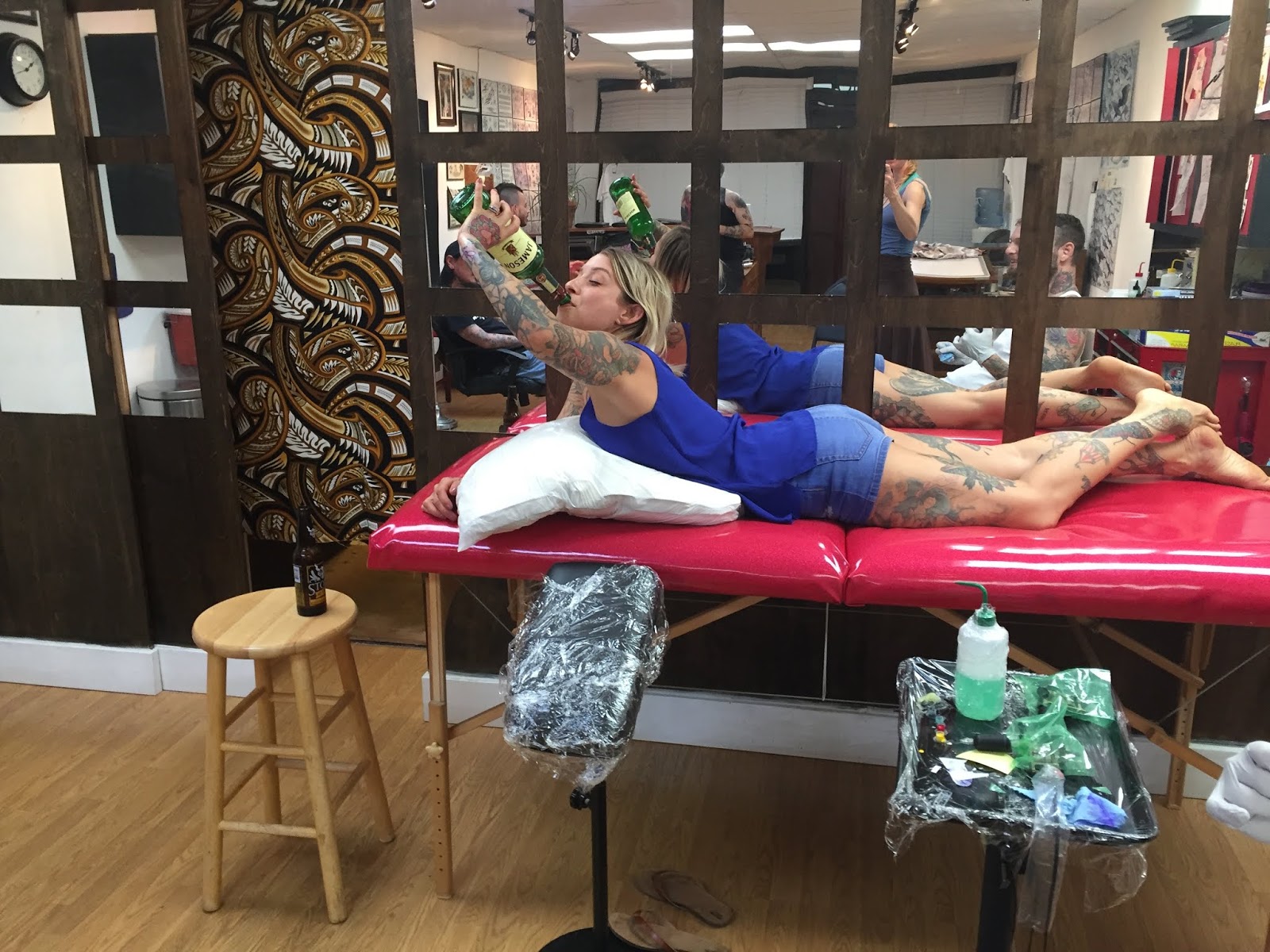 Monica getting hers, happy drunk and happy getting tattooed.