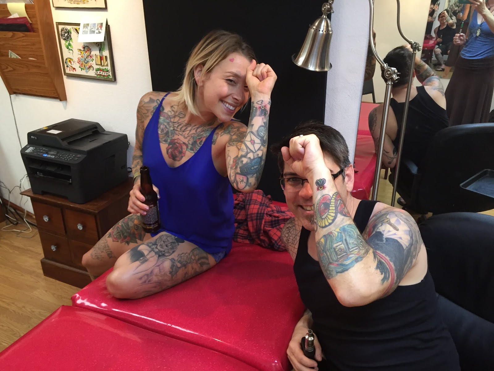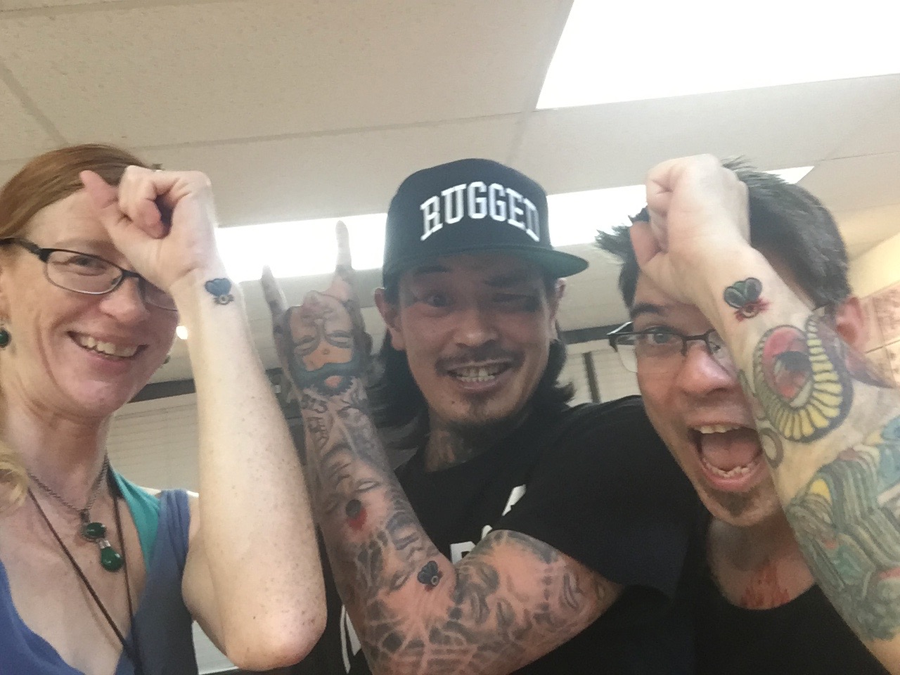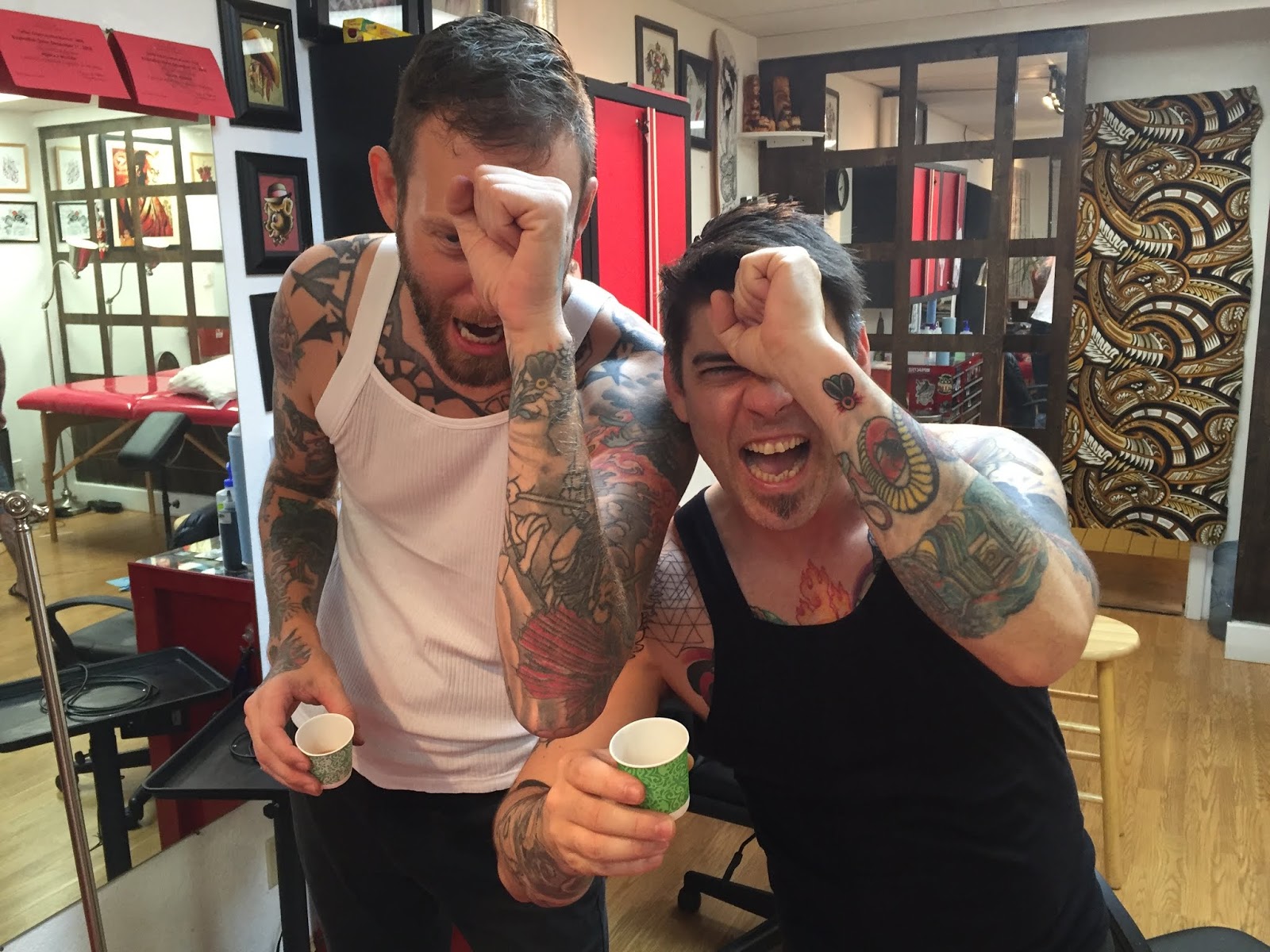 So we got Trevor wasted on Jameson and beer and had him tattoo us all with the bug.  He originally got his from an Aprentice piercer.