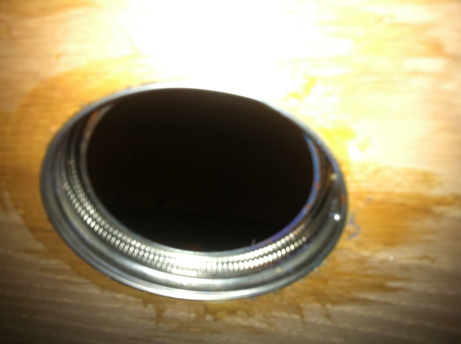 Then I epoxied the lids into the holes, using 4 grooved braid nails on the inside of each top to add the their stability to compensate for the torque when turning the jars out. You can see the braids from the underside of the table.