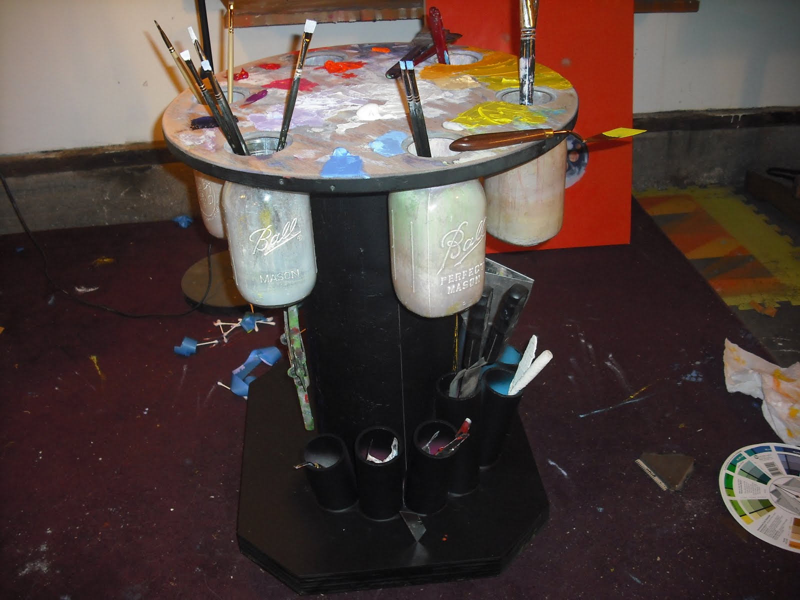 I wipe them off in a very specific pattern on my palette table, following the color wheel and matching the layout of color on the palette top. I find it useful to always be surrounded by the color wheel in as many different ways as possible.