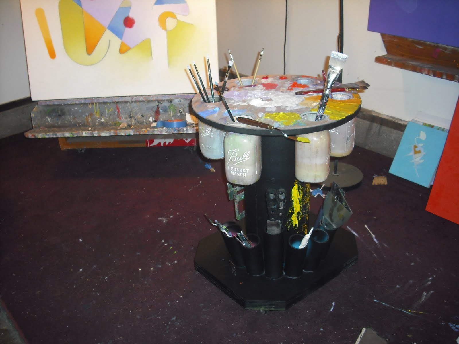 After a session of painting, I clean up the top some and put all my brushes used that day into one of the canning jars.