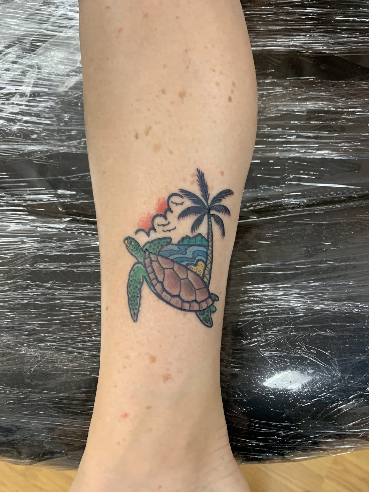 I like a bit of American Traditional in my Hawai’i beach Scene tattoo.